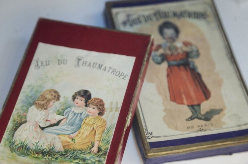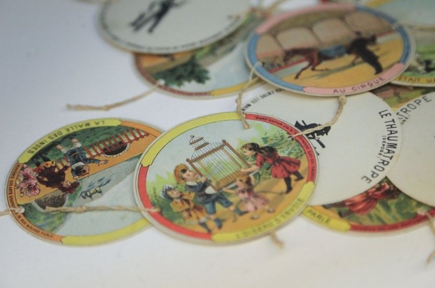 Забавой для взрослых стал тауматроп. Его на спор придумал математик Джон Гершелл, который поспорил с друзьями, что сможет показать им сразу две стороны монеты без использования зеркала. Для этого он просто раскрутил золотую гинею на ребре: человеческое зрение устроено так, что при быстром вращении два изображения слились в одно. Его затею подхватил англичанин Джон Айртон Пэрис. Он и выпустил набор дисков с двусторонними изображениями с двумя веревками по краям, с помощью которых диск раскручивается.