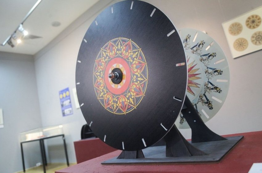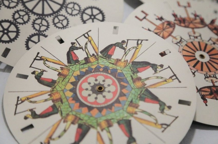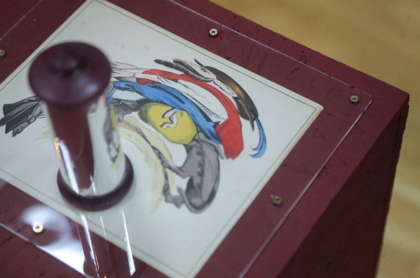 — Мы постарались сделать их антивандальными, но все же они требуют бережного обращения. На прошлых выставках нам удалось сохранить все интерактивные предметы в целости, так что опыт есть. Вы можете устроить свой собственный теневой театр — есть экран и вырезанные для него фигурки людей на палочках, покрутить фенакистископ — больше двадцати приборов, копий увеличенных старинных игрушек, которые можно двигать, вращать, чтобы воспроизвести иллюзии и мультфильмы, созданные более века назад.