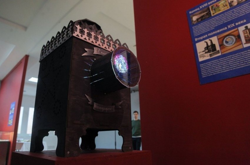Интересно отметить, что для выставки создано множество современных аппаратов и устройств, но не для того чтобы обмануть посетителей, а чтобы дать им возможность прикоснуться к ним лично, увидеть в действии, да и просто поиграть. По словам дизайнера выставки Артура Баязитова, они создавались в мастерской братьев Васильевых:
