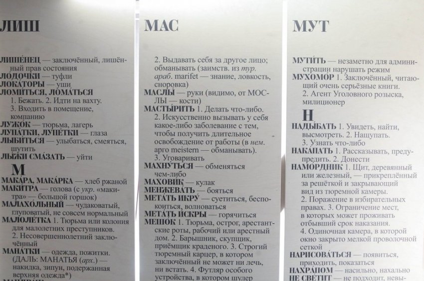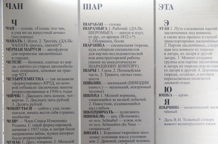 К выбору слов, попавших из словаря на стенды, сотрудники Музея истории ГУЛАГа подходили очень тщательно. Выбрано примерно 300 слов, по 10 на каждую букву. Им хотелось показать и просторечия, и лагерные специфические высказывания, и современные часто употребляемые слова, но родом из-за решетки. Так, можно и без перевода понять, что такое «заначка», «лажа» или «показуха». Однако немногие знают, что «иуда» — это еще и глазок в дверях тюремной камеры, «индюшка» — чай, а «паспорт с температурой» — удостоверение личности, в котором указано, что выдан паспорт на основании статьи 38 (чаще 39) «Положения о паспортах». Эти статьи ограничивали места, где мог жить освободившийся.