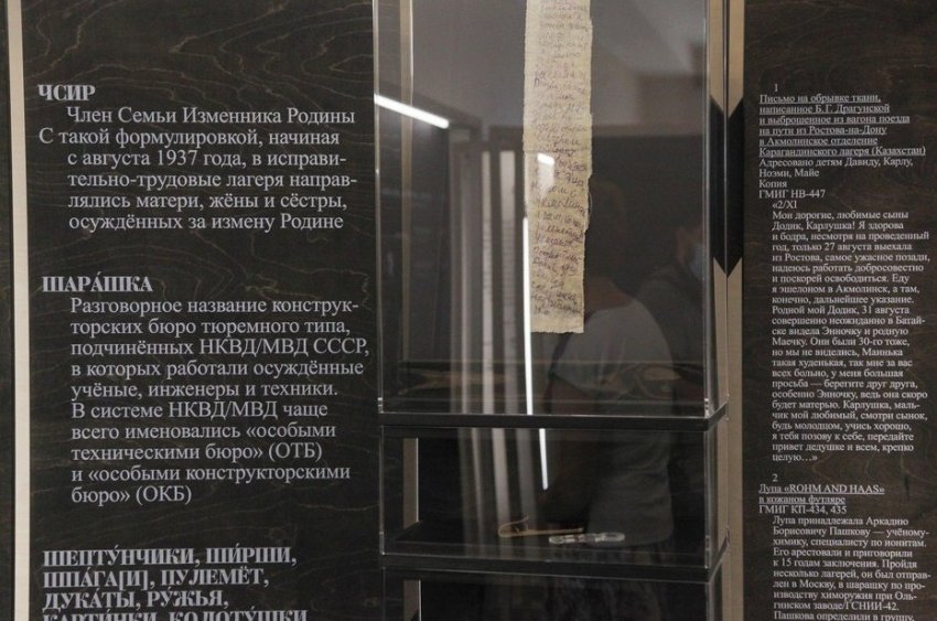 Действительно, совсем не хочется шуметь, когда за витриной видишь лоскут полуистлевшей тряпицы, на которой женской рукой написано послание своим четырем детям. Это письмо на ткани Белла Драгунская выбросила из поезда в надежде, что добрые люди подберут лоскутки и доставят их по указанному на них адресу. Так и вышло. Сегодня и мы можем прочитать эти строчки: «Я здорова и бодра, несмотря на проведенный год, только 27 августа выехала из Ростова, самое ужасное позади, надеюсь работать добросовестно и поскорей освободиться, еду я эшелоном в Акмолинск, а там, конечно, дальнейшее указание…».