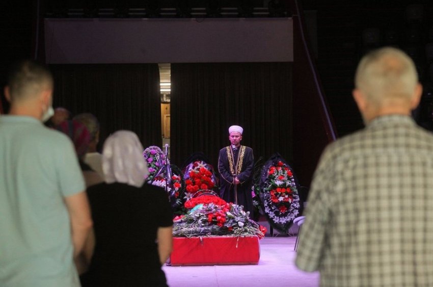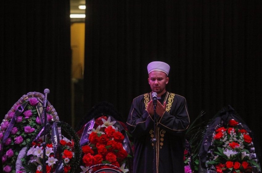 Далее он прочитал короткий джаназа-намаз, после чего под аплодисменты присутствующих покойного вынесли из здания.