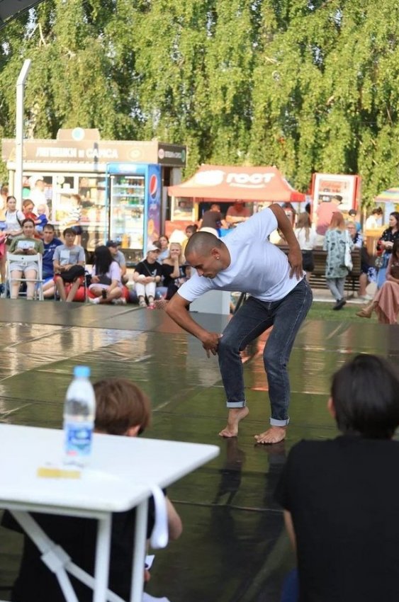 Главная площадка для уличных театров разместилась у входа в драматический театр, а за его зданием, развернулся фестиваль современного танца «Воздух». Модерн, контемпорари, импровизация — то, что «снаружи» порой кажется таким легким (кажется легким до того момента, пока не придет в голову повторить — а тут уж сразу становится понятным, насколько серьезной должна быть подготовка) и завораживающим. Пластичность, музыкальность, умение импровизировать в современном танце обязательны, но есть еще один момент — не проговариваемый, но важный — умение передать зрителю даже не просто эмоции, а состояние, в котором находятся танцующие. Правда, если на несколько минут остановить поток рациональных мыслей, глядя, например, как двигаются Мария и Марсель Нуриевы (привет, Казань) то можно запросто уловить, что ребята, по сути, создают пространство в пространстве, шаманы и волшебники от танца работают с какими-то «тонкими энергиями».