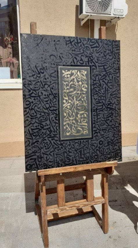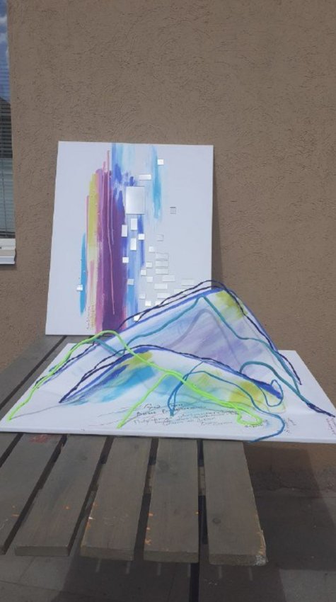 Жительницы Казани Алия Гайнуллина и Диляра Закирова выдали работу на два холста. Это горизонтальная плоскость с горами, возвышающимися над столом. А на заднем фоне — вертикальная картина с наклеенными крохотными зеркалами.