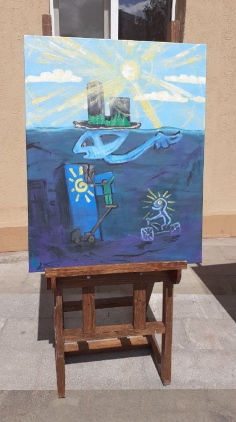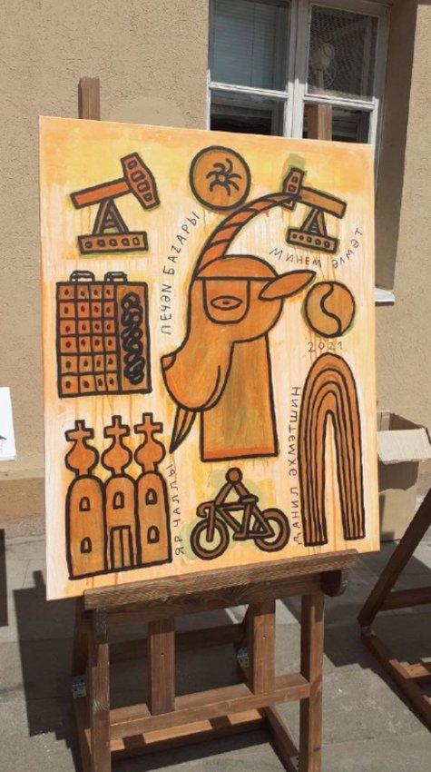 Мне запомнились две работы. Альметьевец Кирилл Шмидт вручал картину со словами: «Ну вы ее не выставите, она ироничная». На ней нарисована рыба-вышка, у которой шляпа с офисами нефтяной компании. А также дом, на котором солнце закрывает мурал. И счастливый горожанин на велосипеде с квадратными колесами. Словом, все, что мы знаем о новом Альметьевске с точки зрения местного жителя.