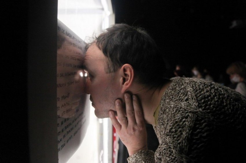 В темном пространстве — пять боксов, в которые заходят актеры и начинают создавать инсталляции. Первая — палит в стекло из пневматики, из пятен складывается картина. Второй — растягивает брендовую футболку на нитках и заколках, чтобы выскользнуть из нее. Третий — ставит бюст неизвестного и выпускает мух. Пятая — вырезает глаза в бумаге со стихами: если в них посмотреть, видишь фото азиатских детей с такими же вырезанными отверстиями.
