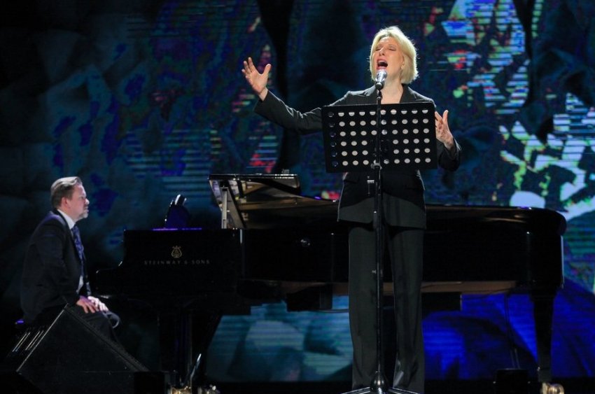 На сцену филармонии Рутберг вышла в брючном костюме. Стройная и подтянутая, она полтора часа стоя отработала программу на фоне знаменитого портрета поэта в синем платье кисти Натана Альтмана. И эта картина появилась на концерте неслучайно. Юлия Рутберг рассказала, что ей не раз задавали вопрос: «На какой портрет вы похожи». Она неизменно отвечала: «Конечно, я похожа на маму и папу, но еще у меня лицо Модильяни и тело Альтмана!»