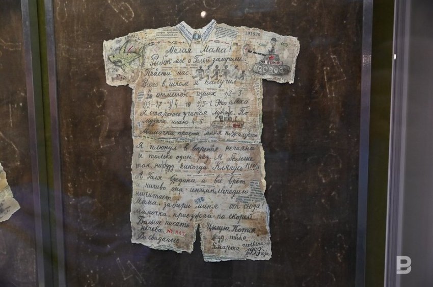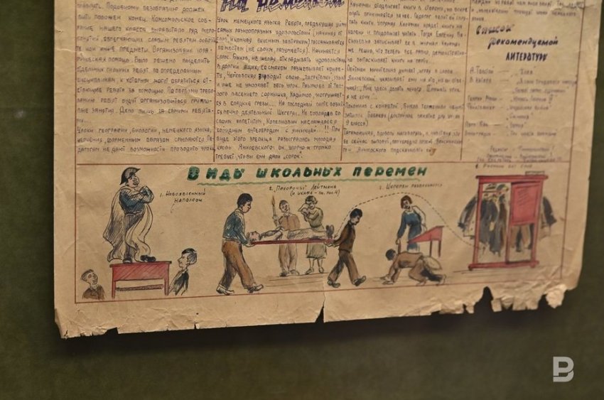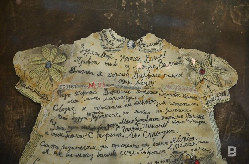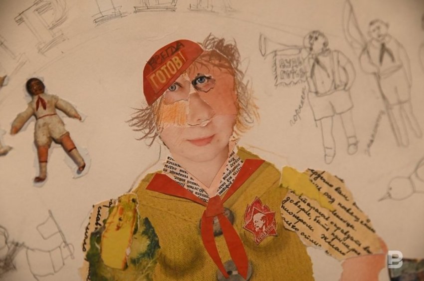 Также с юмором на выставке подобраны витрины с целыми композициями. В них расположились старые стенгазеты с сатирическими карикатурами «Виды школьных перемен», изобличающими хулиганов, списки литературы и рекомендации быть «пионером — всем примером». Особого внимания заслуживает инсталляция с бумажными детскими нарядами. Бумажное платье девочки расписано строчками письма: «Дорогой дедушка! Скажи родителям, чтобы яйца мне больше не привозили. Не могу больше есть. Пусть не заставляют меня надевать панталоны, они большие и торчат. Стыдно!». Костюм мальчика также расписан волнующими строчками: «Дорогая мама, прости меня. Я в варенье плюнул только один раз и нечаянно». Композиция дополнена маленькими детскими ботинками и игрушечным самолетом. Ведь и здесь можно вспомнить собственные строчки письма из пионерлагеря: «Нас сегодня измеряли. Мой рост 134 не запомнила чего»…