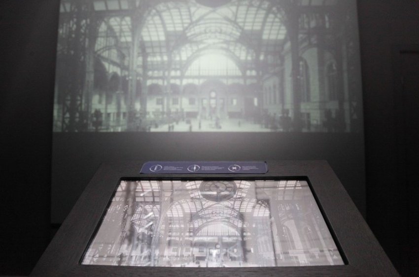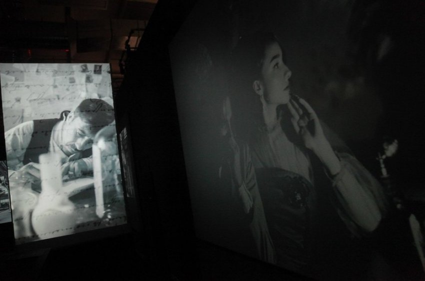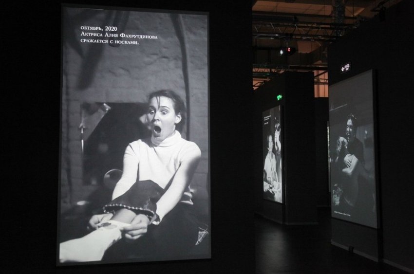 Интересно, что первая часть выставки, которая представляет из себя темный лабиринт, освещаемый только экранами с фотографиями во всю стену, начинается с портретов семьи Карениных. Их меняли перед спектаклем в зависимости от того, кто сегодня играет главных действующих лиц. Можно представить, сколько вариантов портретов накопилось в архиве спектакля, если только Сережу Каренина играли два мальчика.