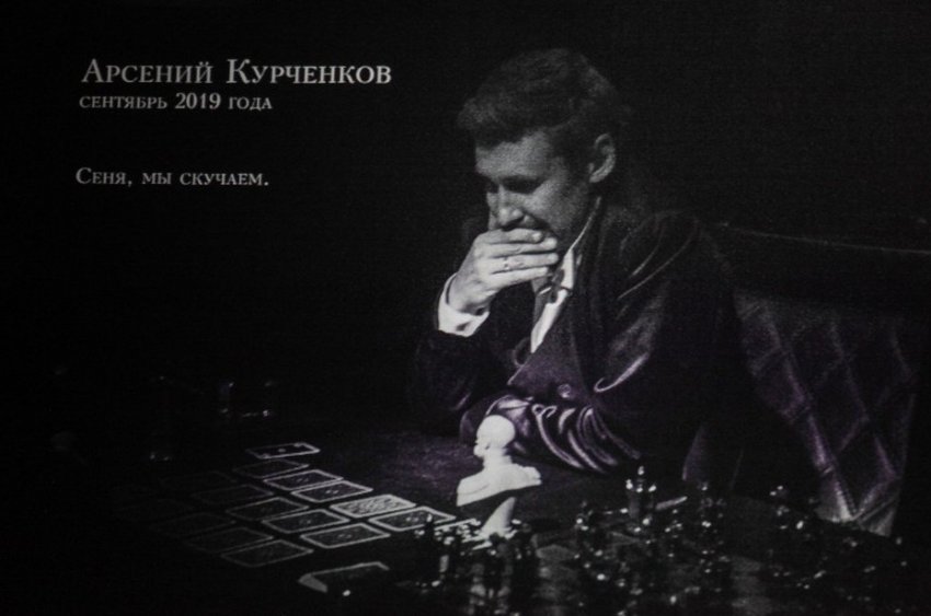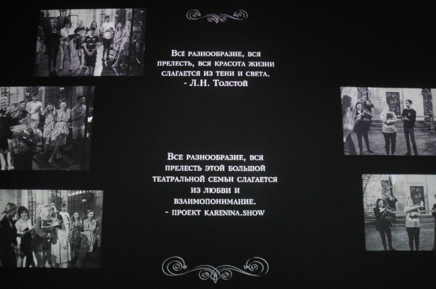 Первый зал мультимедийной выставки посвящен актерам, встречам с героями спектакля. Здесь можно увидеть черно-белые фото артистов, которые исполняли ту или иную роль, — за время жизни спектакля актерский состав неоднократно менялся, и, например, только Китти в разное время играли четыре актрисы. О каждой из них, как и об остальных исполнителях, на фото сказано несколько теплых слов. Вспомнили в первом зале и безвременно ушедшего актера Казанского ТЮЗа Арсения Курченкова, исполнявшего роль Алексея Каренина, — размещена его фотография в костюме мужа Анны, датированная сентябрем 2019 года.