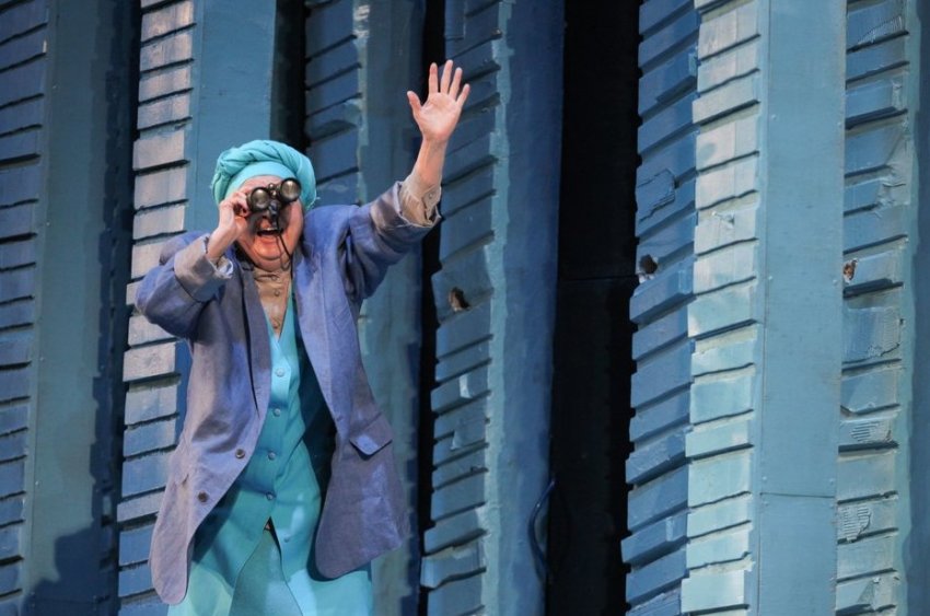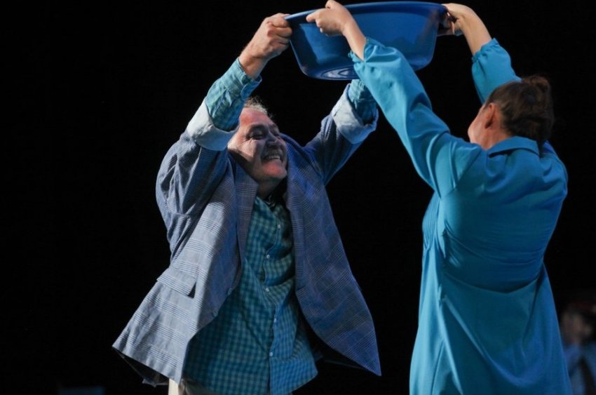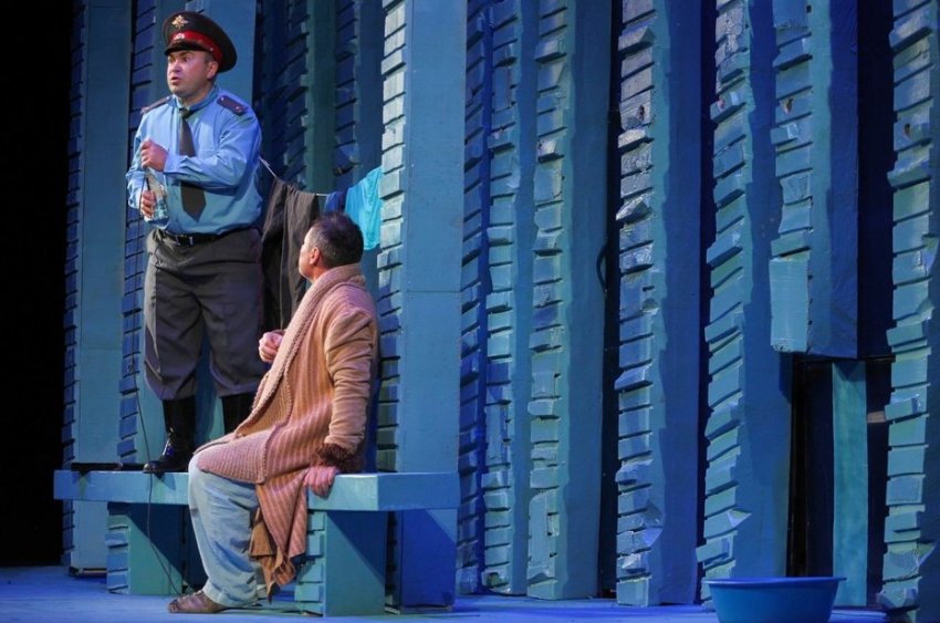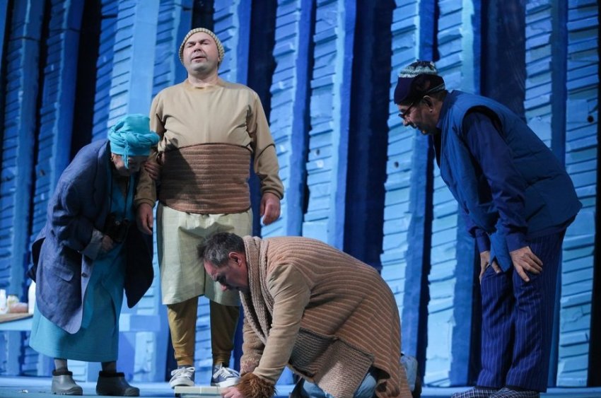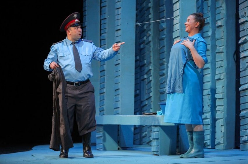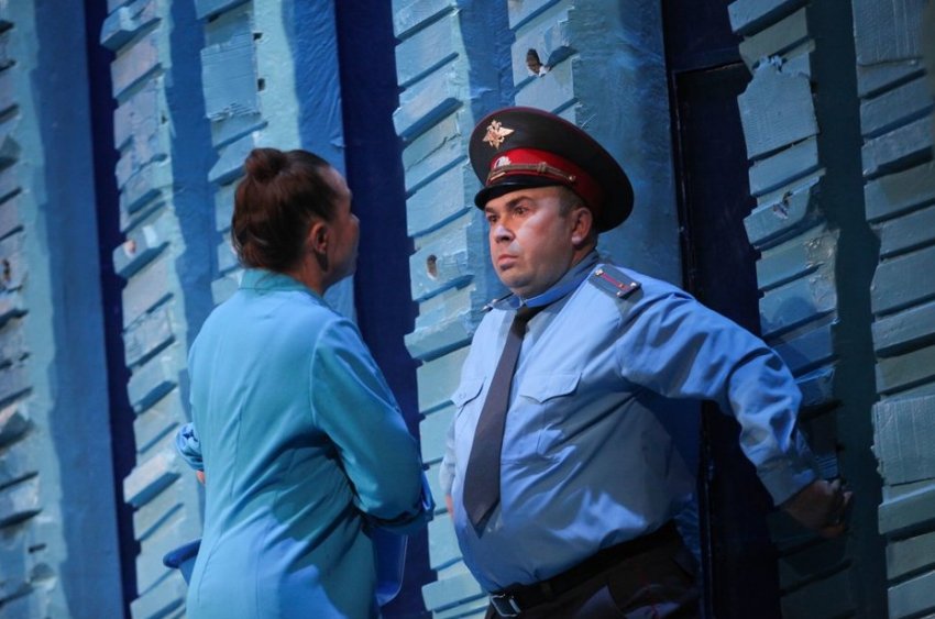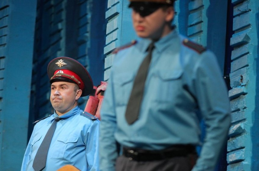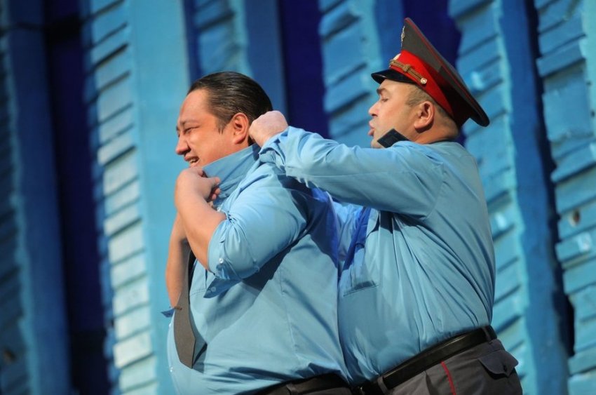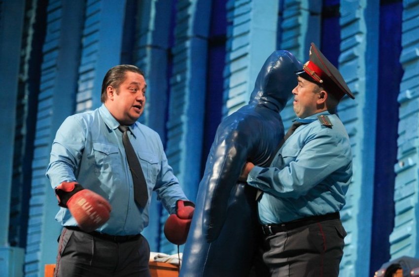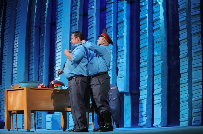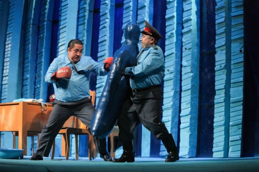 Сходу замечаешь, что почти все на сцене — либо голубого, либо охристого цвета: от формы стражей закона до эффектного делового костюма продавщицы. Может, это код? Но это лишь игра символами в ситуации, когда развивать нечего. Ильяс Камал как композитор (и дирижер в фуражке) расставляет по спектаклю комичные эффекты, но его функция — лишь подчеркивать абсурдность ситуаций.