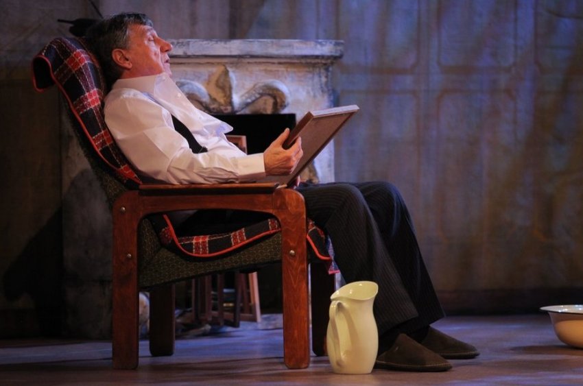ТЮЗовскую постановку «Юбилея ювелира» можно назвать минималистичной с точки зрения декораций — они не меняются на протяжении двух действий: бедно обставленная комната, с потолка капает вода (звук которой нервирует зрителя), на сцене — только кресло и стол, в глубине — камин, из которого Морис и извлекает заветное ожерелье для королевы. Можно сказать, что в первом действии ничего не происходит — воспоминания, знакомящие с жизнью и бытом, диалоги с шутками, вызывающими редкий смех в зале… После антракта зал значительно поредел — сказалась затянутость первой части спектакля. Радион Букаев сообщил, что на премьере первое действие шло 56 минут — ровно на 3 минуты больше задуманного: «Паузы были, а современный зритель не готов их выдерживать». А еще режиссер рассказал, что и так сократил пьесу, которая должна была быть вдвое длиннее. «А если бы мы разыгрались, вы бы до полуночи не ушли», — добавил Вячеслав Казанцев (впрочем, антракт показал: уходить не мешало абсолютно ничто).