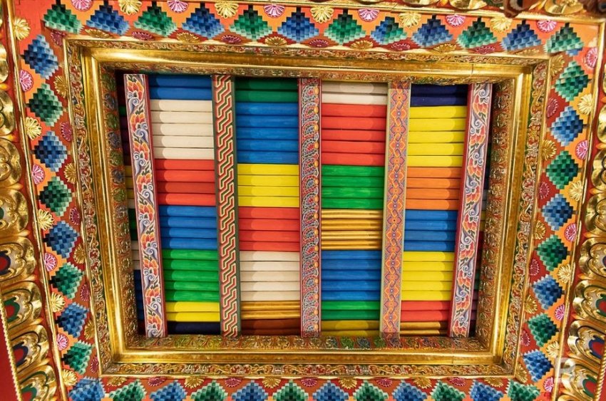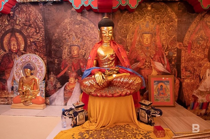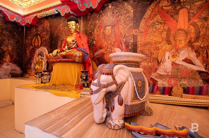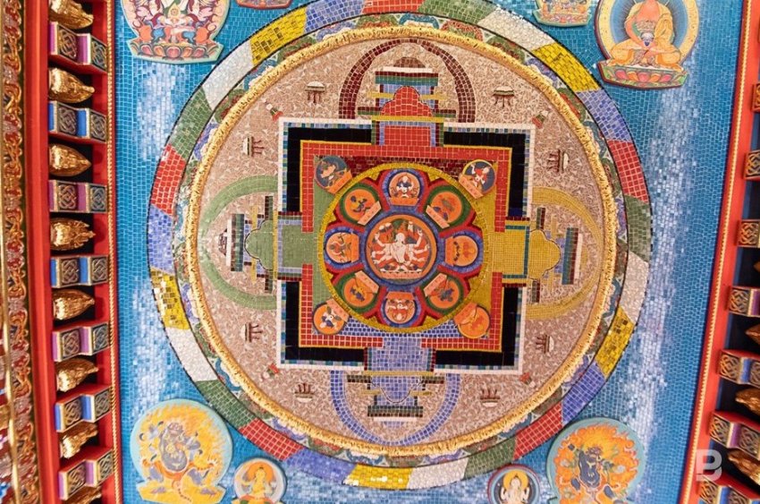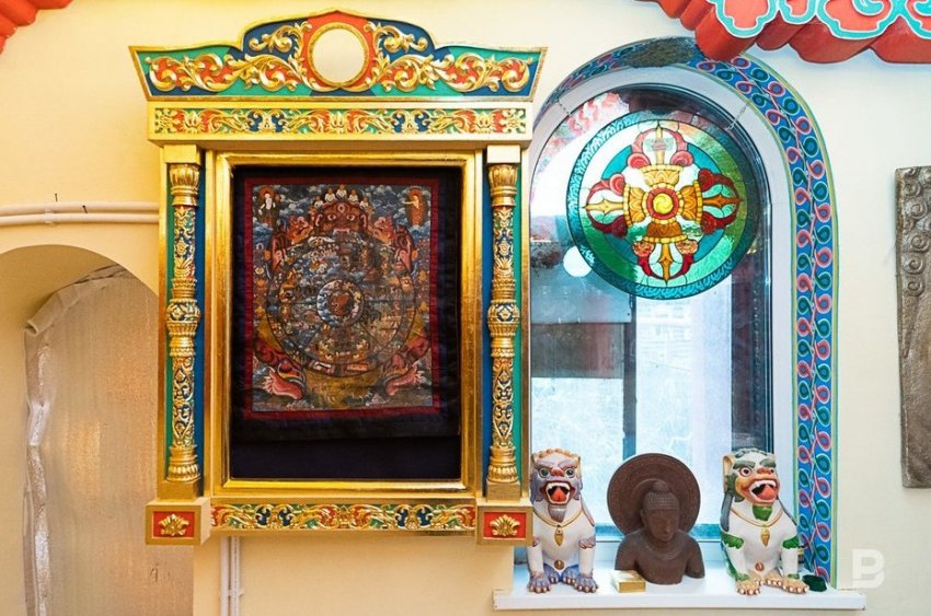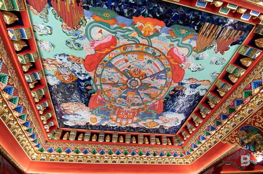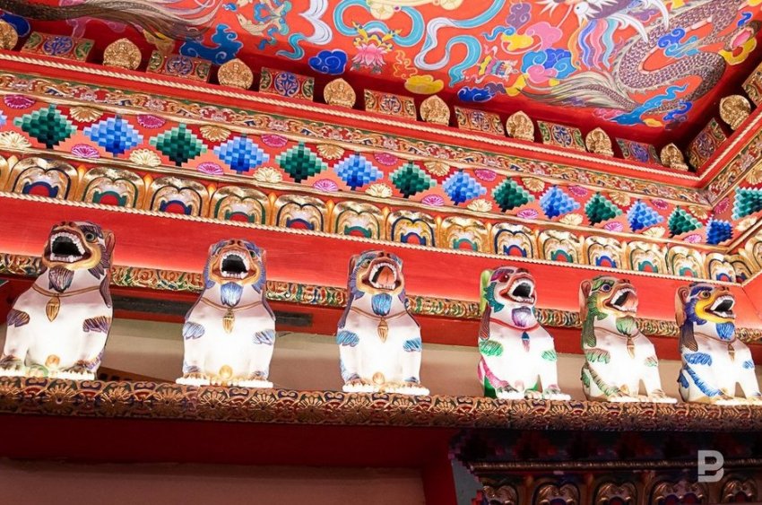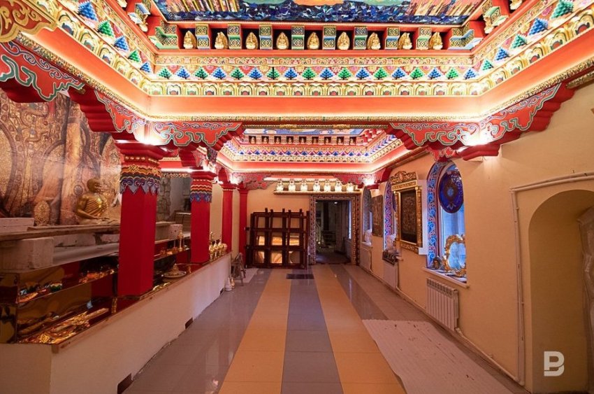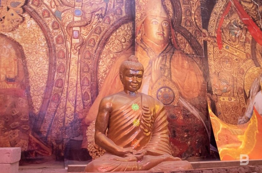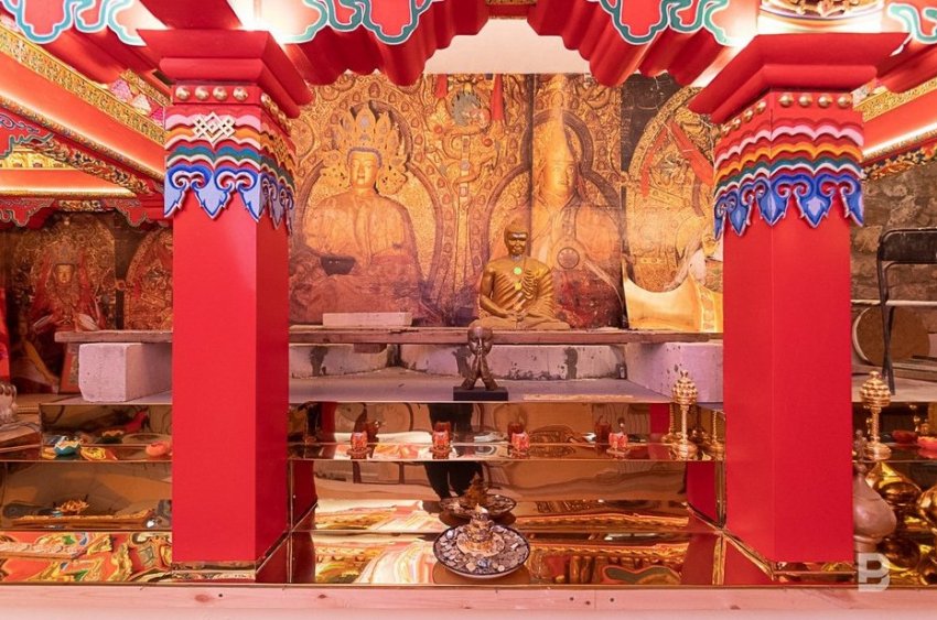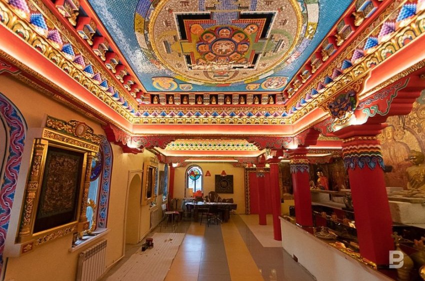 На очереди — открытие буддийского зала. Работа над ним стартовала прошлой зимой. Сейчас в нем осталось завершить отделку алтаря и, как говорит Ханов, «сделать небеса» — установить над ним деревянные балки со светильниками на потолок. Помещение получилось очень ярким и богато декорированным. Потолок украшен росписью и мозаикой, примыкающий к нему гипсовый фриз — орнаментом и нишами с золочеными фигурками Будды.