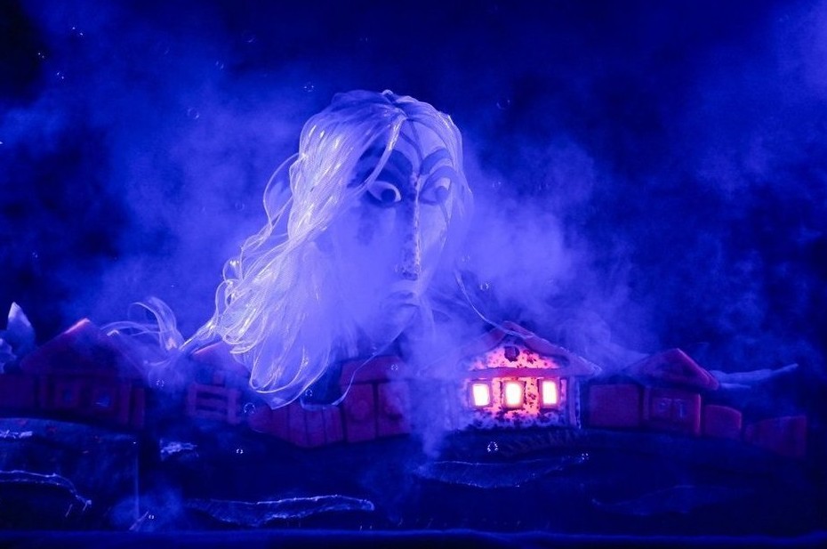 В конце Водяная, переборов себя, возвращается в деревню. И здесь она сначала уменьшается и бродит вдоль деревенских домиков. А потом внезапно становится просто огромной и наводит легкий испуг даже на зрителя, возвышаясь над крохотной сценой.