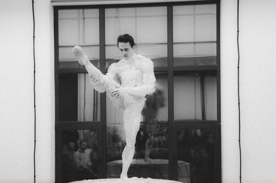 Гипс сохнет, трескается, танцор начинается медленно двигаться, не забывая о безопасности и балетной школе. Круг вертится, гипс скользкий. В конце герой покидает постамент. Именно постамент, хотя в мастерских был бы более уместен стол. Но зато как символично на нем остается «пепел» — остатки гипса.