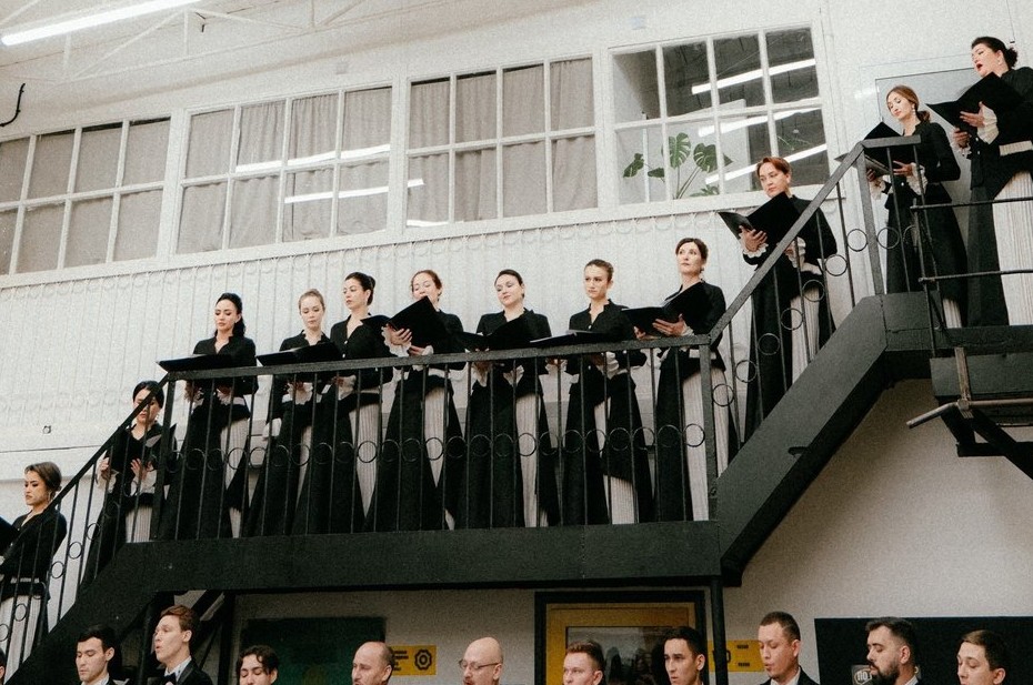 Хор Таминдаровой стоит сбоку, внизу и на лестнице и исполняет семь стихотворений, практически полностью оттягивая на себя внимание. Дополнительного света нет. Миляуша Таминдарова энергично дирижирует по памяти.