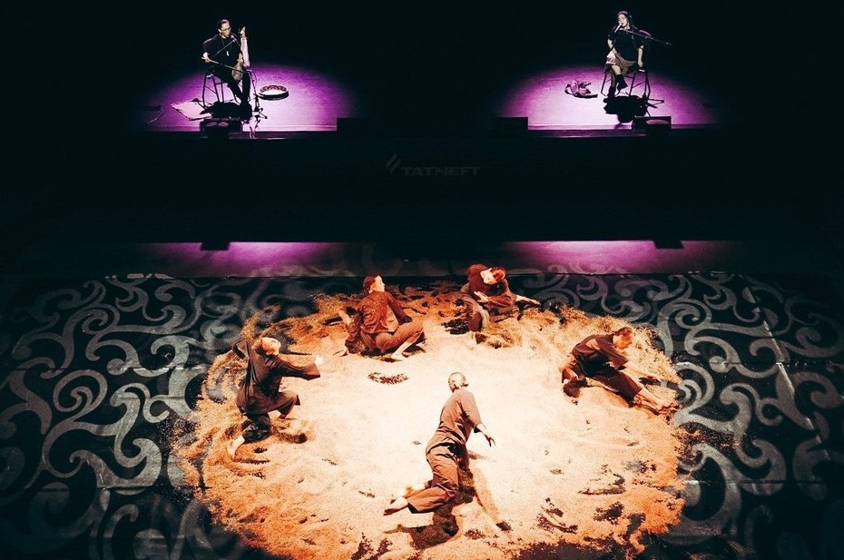 «Нәкыш», пожалуй, самый цельный, универсальный и красивый спектакль среди четырех. Марсель Нуриев в нем режиссирует. Его жена Мария Нуриева танцует и ведет за собой еще четырех девушек из Казани и Альметьевска. Сугдэр Лудуп и София Озджан инструментами и голосами наводят шороху, на пол проецируются орнаменты. Танцовщицы танцуют на овсе, рассыпают его, отодвигают, рисуют, строят круг, который становится похожим на крепость, собирают зерно в подол (кажется, что это можно транслировать как рождение нового), устраивают задорный праздник. Как и любой внятный танцевальный спектакль, сюжет выстраивается зрителем, а танцоры в течение 50 с лишним минут радуются, печалятся и умирают.
