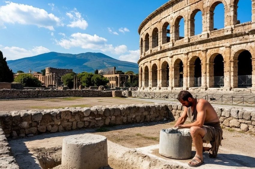 В 2023 году археологи начали раскопки в очередном районе Помпей, надежно законсервированных под вулканическим пеплом. И нашли целую мастерскую, в которой готовили бетонные смеси для строительства. Все сохранилось удивительно хорошо: материалы, инструменты и даже пометки на стенах: график работ и расчеты материалов — то есть фактически точный рецепт римского бетона! На этой неделе вышла статья, описывающая технологию.