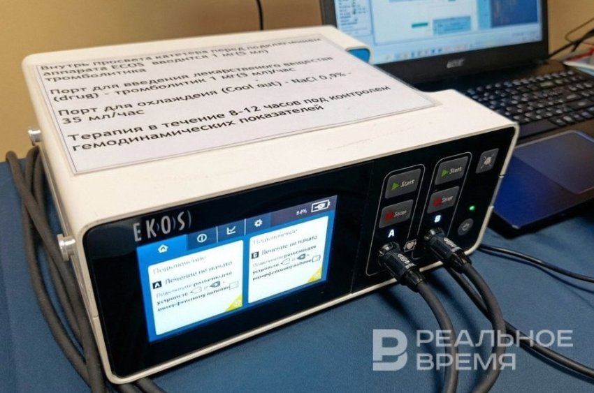— Этот прибор производится в США. Он генерирует ультразвуковые импульсы на двух специальных катетерах. Эти катетеры с двух сторон вводятся в легочную артерию, закупоренную тромбом, и начинают ультразвуком «раскручивать» нити фибрина, из которых состоит тромб. И тромб начинает разрушаться. Эффект мы получаем колоссальный! Вот пример: пациентка 62 лет в 2025 году поступила к нам в крайне тяжелом состоянии, с массивной ТЭЛА. У нее были такие показатели, при которых шансов выжить практически не было. И мы приняли решение впервые в Поволжском федеральном округе применить в ее лечении этот прибор. Через четыре часа после начала терапии у пациентки стабилизировалось состояние: с 85 до 92 поднялась сатурация. А по окончании терапии, через 12 часов, сатурация дошла до 98%. Пациентку мы выписали через 7 дней, без каких-либо жалоб.