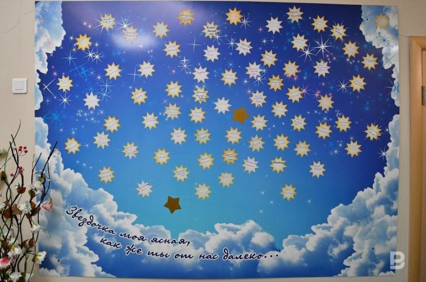 На стене прощальной комнаты — панно с несколькими десятками бумажных звездочек. На каждой звездочке написано чье-то имя.