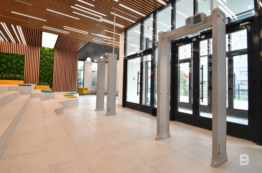 Первое, что бросается в глаза — у здания появилась входная группа. Хотя она выполнена из стекла, но это позволяет хорошо просматривать внешний контур. Система контроля и управления доступом позволит попасть внутрь только педагогам и ученикам по картам входа. Кроме того, предусмотрена блокировка дверей, соединяющих основное здание школы с появившимся у нее пристроем. Второй заслон — две рамки металлодетектора. Сразу за ними — холл с амфитеатром, в котором родители могут ожидать выхода после уроков детей, а дети — припозднившихся родителей. В этом отсеке оборудован теплый пол, чтобы было нехолодно зимой, а стена украшена панно из настоящего мха.