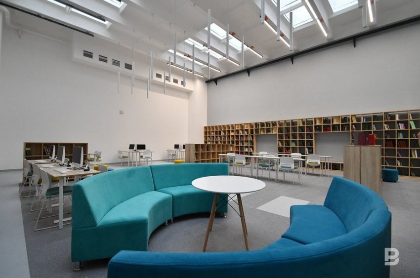 Столовая тоже получила новое оборудование и мебель, ее площадь увеличилась на 40 посадочных мест. Особая фишка — трансформируемое мультифункциональное помещение библиотеки, которое стало одновременно и коворкингом, и местом для проведения встреч и уроков. Его сделали из одного из двух спортивных залов. На антресолях разместится музей истории Советского района с небольшим кафетерием, где будут стоять вендинговые автоматы.