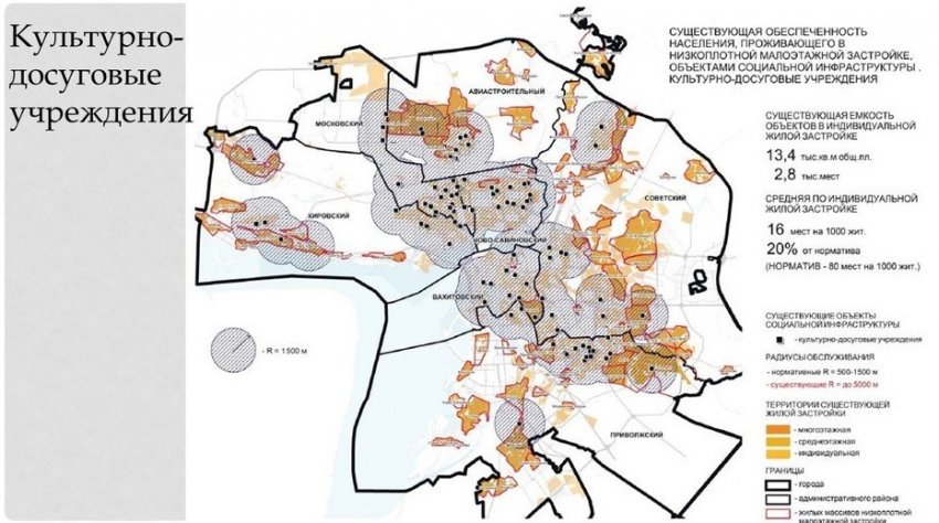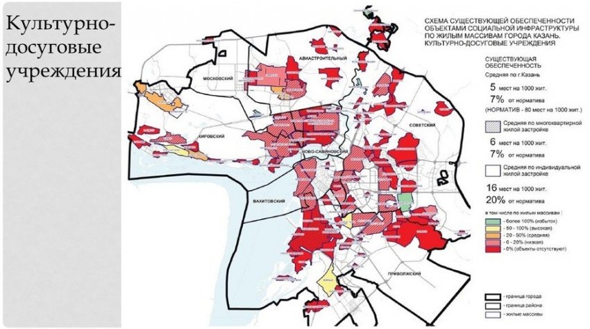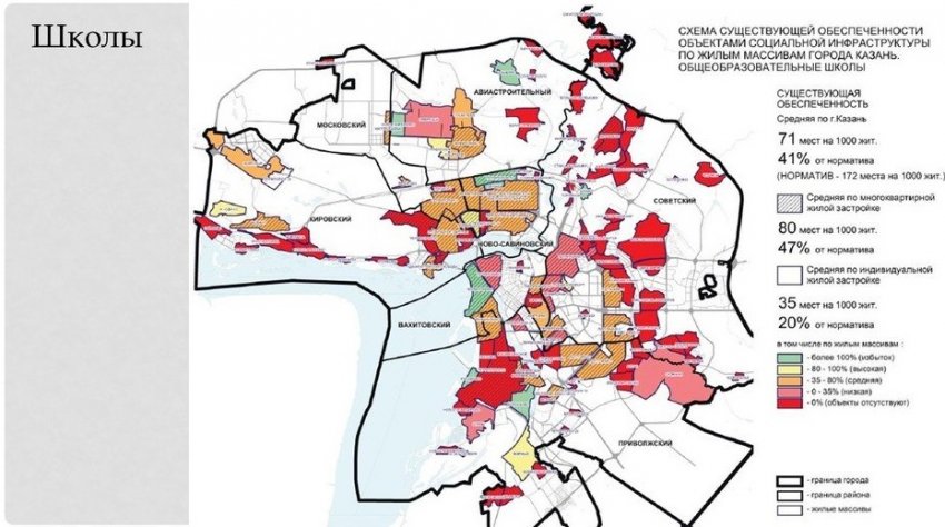 Документ территориального планирования рассчитали на максимальную численность населения Казани к 2040 году — 1,521 млн человек. Он исходит из показателей нормативов мест в учреждениях на 10 тыс. кв. м общей площади квартир и на 100 индивидуальных домовладений. Для каждой зоны комплексно определен перечень социальных объектов местного значения. Нет в Генплане и привязки к месту.