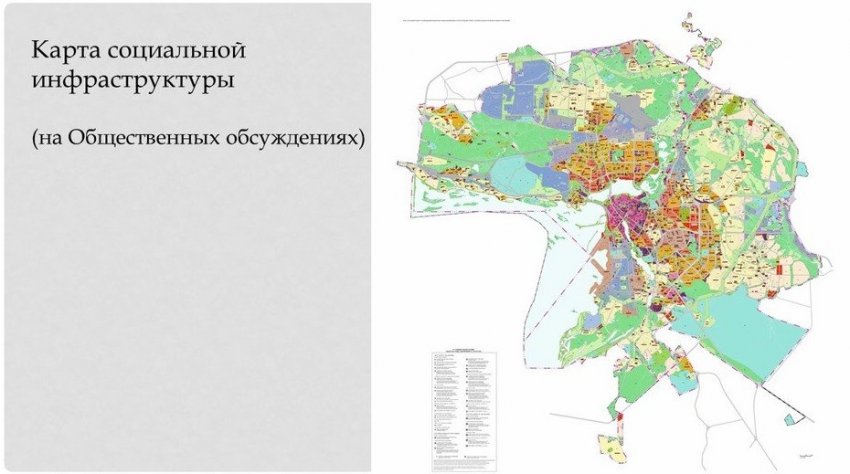 Муниципальные чиновники утверждают, что разработчики Генплана провели большую аналитическую работу, выявляя и прогнозируя потребности города. Анастасия Латыпова представила карту социальной инфраструктуры с объектами местного, федерального и регионального значения.