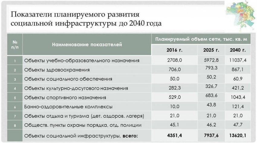 Согласно проекту, общая площадь объектов социальной инфраструктуры в 2040 году увеличится на 9,3 млн кв. м, а показатель обеспеченности населения объектами социальной инфраструктуры в целом по городу вырастет в 2,6 раза — с 3,6 кв. м на одного жителя до 9,5 кв. м — такова цель стопроцентного обеспечения населения социальными объектами.