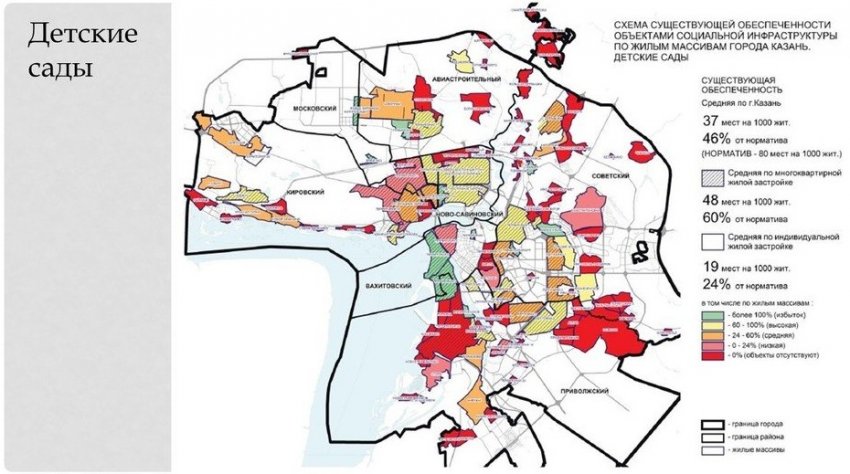 Начальник Управления образования исполкома Казани Ильнар Хидиятов рассказал о том, что самая высокая потребность — около 15 тысяч мест для дошкольников — сегодня в микрорайонах «Центр», «Азино 1» и «Азино 2» в Советском районе. Потребность в увеличении дошкольных мест более чем на 2 тыс. существует в девяти микрорайонах Ново-Савиновского, Советского и Приволжского районов. Есть потребность в увеличении на 1 тыс. дошкольных мест еще в каждом из 22 микрорайонов города.