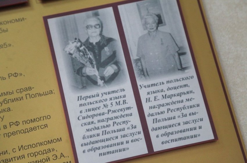Первым учителем польского в школе №5 стала полька по национальности, выпускница варшавской гимназии пани Мария Сидорова-Ржевутска. По окончании филологического факультета КГУ преподавала русский язык и литературу в школе №116, а придя в школу №5, разработала авторскую программу по изучению польского языка в начальной школе. А в начале 90-х авторскую программу преподавания польского языка в 5—11-м классах разработала доцент КГУ, кандидат филологических наук, полонист Неонилла Маркарьян.