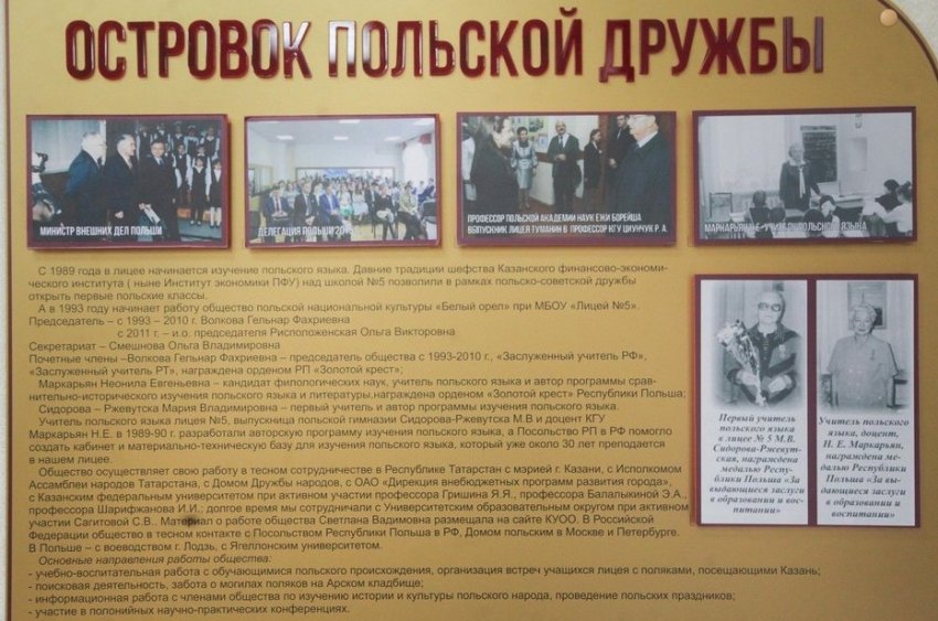 После того, как в 2019 году в Санкт-Петербурге в ходе реорганизации ликвидировали школу №216 имени Адама Мицкевича с углубленным изучением польского языка, казанский лицей №5, одна из старейших средних школ Татарстана, оказался единственным российским средним учебным заведением, где в учебный план включен этот язык. Пусть в качестве второго иностранного и только у средне- и старшеклассников, но все же. И даже сейчас, в условиях непростых взаимоотношений России с Польшей, здесь не собираются избавляться от этого экзотического для стандартной сетки расписания предмета.