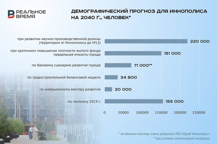 В основу генплана Иннополиса легла более ранняя разработка Института пространственного планирования РТ — мастер-план развития МО «Город Иннополис» и прилегающих к нему территорий 2023 года. Проектировщики исходили из нескольких возможных сценариев демографического прогноза, согласно которым население Иннополиса к 2040 году может составить от 20 тыс. до 220 тыс. человек.