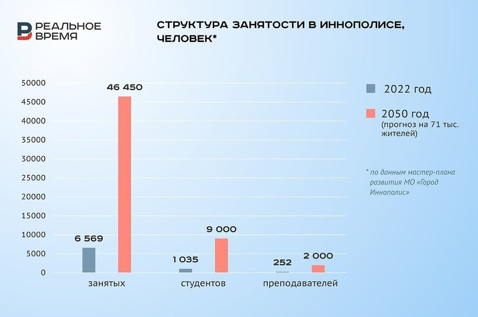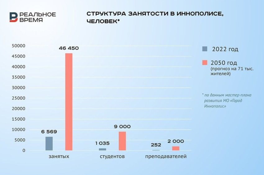 В мастер-плане была просчитана примерная структура занятости населения исходя из базового сценария демографического прогноза (71 тыс. жителей к 2050 году). Количество занятых, по сравнению с 2022 годом, должно было вырасти в 7 раз, студентов — в 8,7 раза, преподавателей — 8 раз.