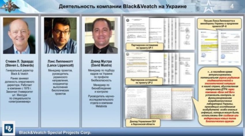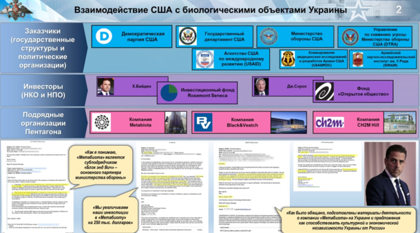 - В распоряжении Министерства обороны России оказалась переписка сына президента США Джо Байдена — Хантера Байдена с сотрудниками Управления по снижению угрозы американского Минобороны и подрядных организаций Пентагона на Украине. Содержание писем показывает, что он сыграл важную роль в создании финансовой возможности проведения работ с патогенами на территории Украины, обеспечив привлечение средств для компаний Black and Veach и Metabiota. Опубликованная переписка свидетельствует о том, что истинные цели Пентагона на Украине далеки от научных — например, вице-президент Metabiota заявляет, что деятельность компании будет направлена на обеспечение «…культурной и экономической независимости Украины от России …».