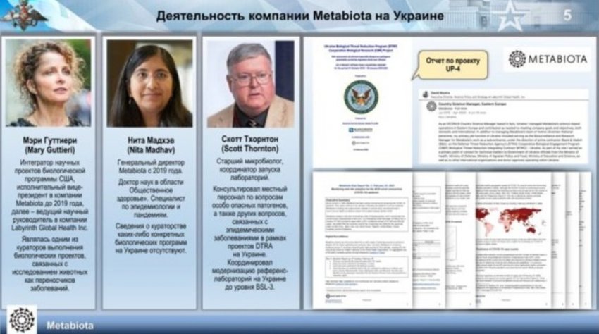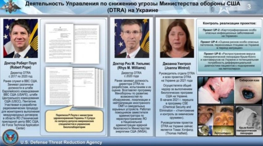 - В ведомстве также назвали имена и фамилии конкретных должностных лиц, участвовавших в создании компонентов биологического оружия на Украине: экс-сотрудник DTRA и директор Программы совместного снижения угрозы Роберт Поуп, глава офиса DTRA на Украине Джоанна Уинтрол, руководитель украинского подразделения компании Black and Veach Лэнс Липпенкотт, представитель Metabiota на Украине Мэри Гуттиери и другие.