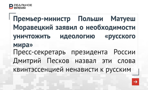 - Депутат Госдумы от Татарстана Олег Морозов отреагировал на высказывания премьер-министра Польши Матеуша Моравецкого, который в своей колонке для Telegraph назвал русский мир «раковой опухолью». Парламентарий считает, что такими заявлениями «Польша побуждает нас поставить ее на первое место в очередь на денацификацию после Украины».
