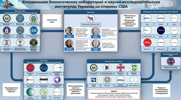 - Министерство обороны России опубликовало новые данные о деятельности биолабораторий США на Украине, сообщив, что ее идеологи — лидеры Демократической партии, к ней причастны бывший и нынешний президенты Штатов Барак Обама и Джо Байден. Через органы исполнительной власти США формировалась законодательная база для финансирования военно-биологических исследований напрямую из средств федерального бюджета. Под госгарантии привлекались средства неправительственных организаций, подконтрольных руководству Демократической партии, заявили в Минобороны РФ. В схему были вовлечены крупные фармацевтические компании — Pfizer, Moderna, Merck, а также аффилированная с американским военным ведомством компания Gilead. Американскими специалистами ведутся работы по испытанию новых медицинских препаратов в обход международных норм безопасности, утверждают в Минобороны России.