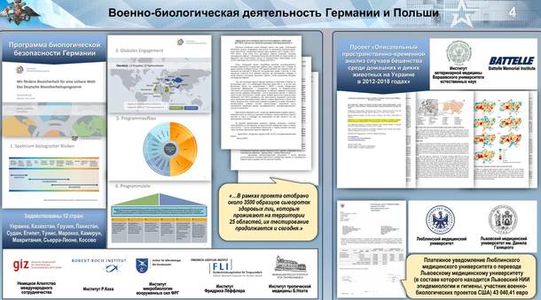 - Как выяснило Минобороны России, военно-биологические проекты на украинской территории реализуют не только США, но и другие страны НАТО. Так, ФРГ в 2013-м запустила собственную программу по биобезопасности с участием 12 стран, в том числе Украины. С 2016-го по 2019-й военные эпидемиологи из немецкого института микробиологии вывезли 3,5 тысячи проб сыворотки крови украинцев. Польский Институт ветеринарной медицины участвовал в исследованиях вируса бешенства на Украине, причем они проводились совместно с американским Институтом Бэттел — одним из ключевых подрядчиков Пентагона.