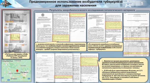 - Минобороны России также рассказало о свидетельствах преднамеренного использовании в 2020 году возбудителя туберкулеза с множественной лекарственной устойчивостью для заражения населения Славяносербского района ЛНР. По данным ведомства, среди несовершеннолетних населенного пункта Степовое распространили фальшивые денежные купюры, инфицированные возбудителем туберкулеза. «Организаторы этого преступления учли особенности поведения детей, которые имеют привычку все «тянуть в рот» и брать продукты питания немытыми руками», — объяснили в ведомстве.