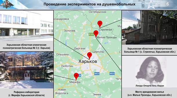 - Также Минобороны России раскрыло данные об опытах Пентагона над гражданами Украины в психиатрической больнице №1 в селе Стрелечье Харьковской области. Основной категорией подопытных служила группа пациентов-мужчин в возрасте от 40 до 60 лет с высокой стадией физического истощения. Для сокрытия принадлежности к США проводившие биологические исследования эксперты прибывали через третьи страны. В январе иностранцев, проводивших эксперименты, экстренно эвакуировали, а используемое ими оборудование и препараты вывезли в западные области Украины.