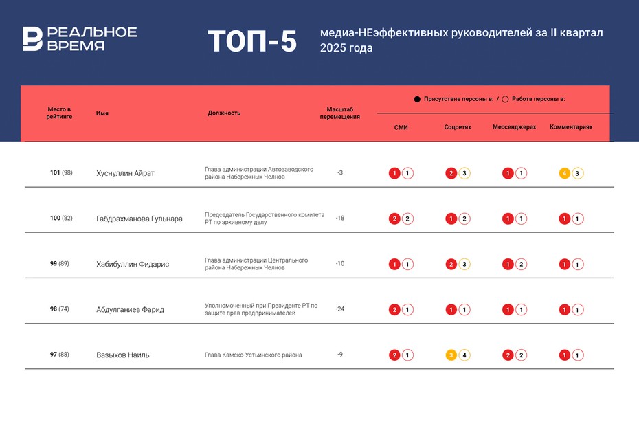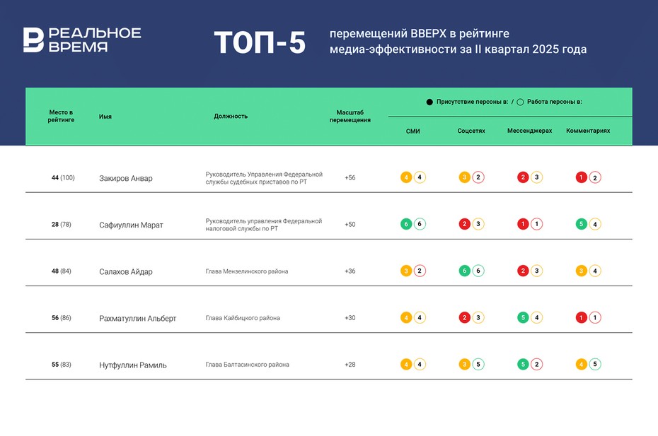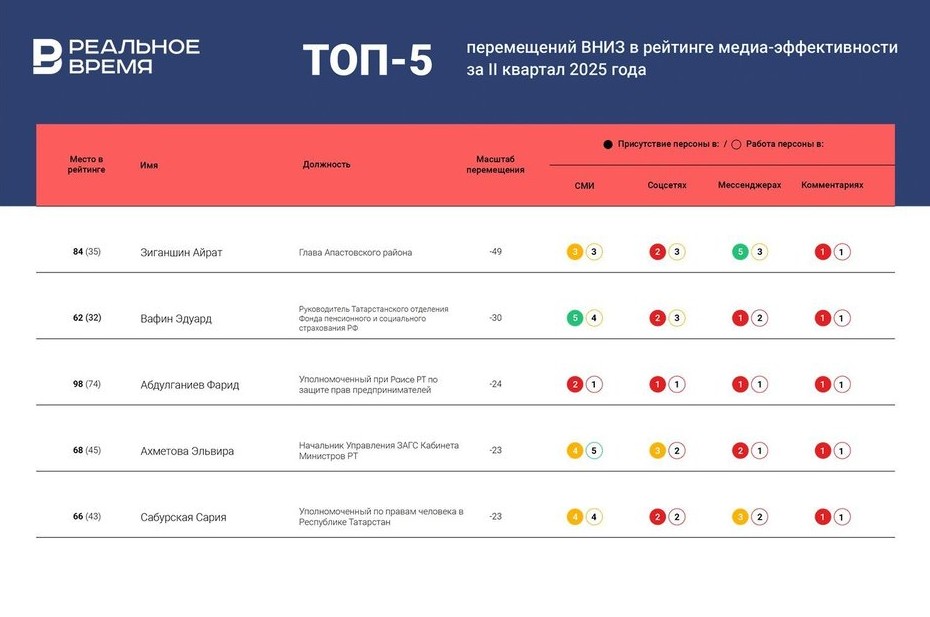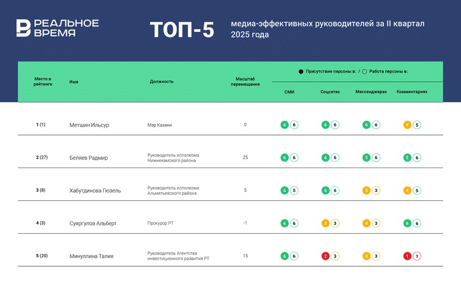 Агентство «ПромРейтинг» опубликовало результаты исследования медиаэффективности руководителей министерств и ведомств, а также глав городов и районов Татарстана за второй квартал 2025 года. По сравнению с предыдущим периодом в топ-5 остались только бессменный лидер рейтинга, мэр Казани Ильсур Метшин и прокурор республики Альберт Суяргулов, потерявший одну строчку. Вместо главы МВД по РТ Дамира Сатретдинова, мэра Зеленодольска Михаила Афанасьева и главы следственного управления СКР по республике Валерия Липского в топ медиаэффективности ворвались главы исполкома Нижнекамского и Альметьевского районов Радмир Беляев и Гюзель Хабутдинова, а также главная по инвестициям в Татарстане Талия Минуллина. Подробнее — в материале «Реального времени».